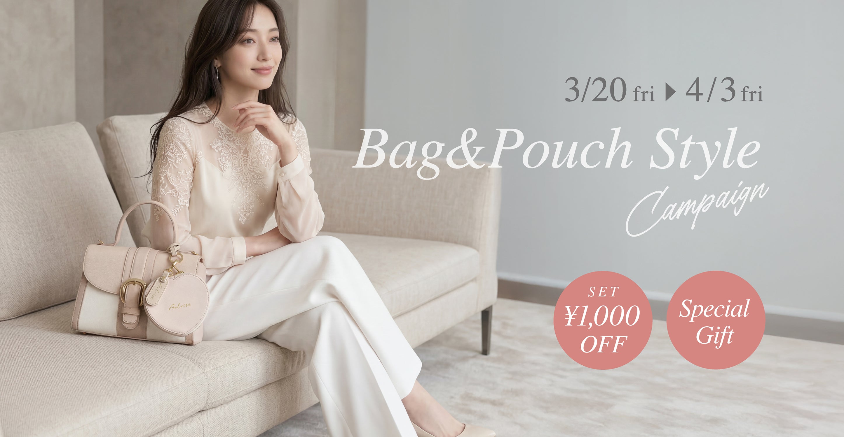 春のやわらかな光に似合う、上品で軽やかなスタイル。Arlriseでは、バッグとポーチをセットで楽しめる「Bag & Pouch Style Campaign」を開催いたします。 上品なデザインのバッグに、さりげなく寄り添うポーチ。日常にほんの少しの特別感を添えてくれる組み合わせです。 期間中は、セットでのご購入で1,000円OFFに加え、オリジナルキーホルダーを1点プレゼント。 春の装いをより美しく引き立てるアイテムを、この機会にぜひお楽しみください。